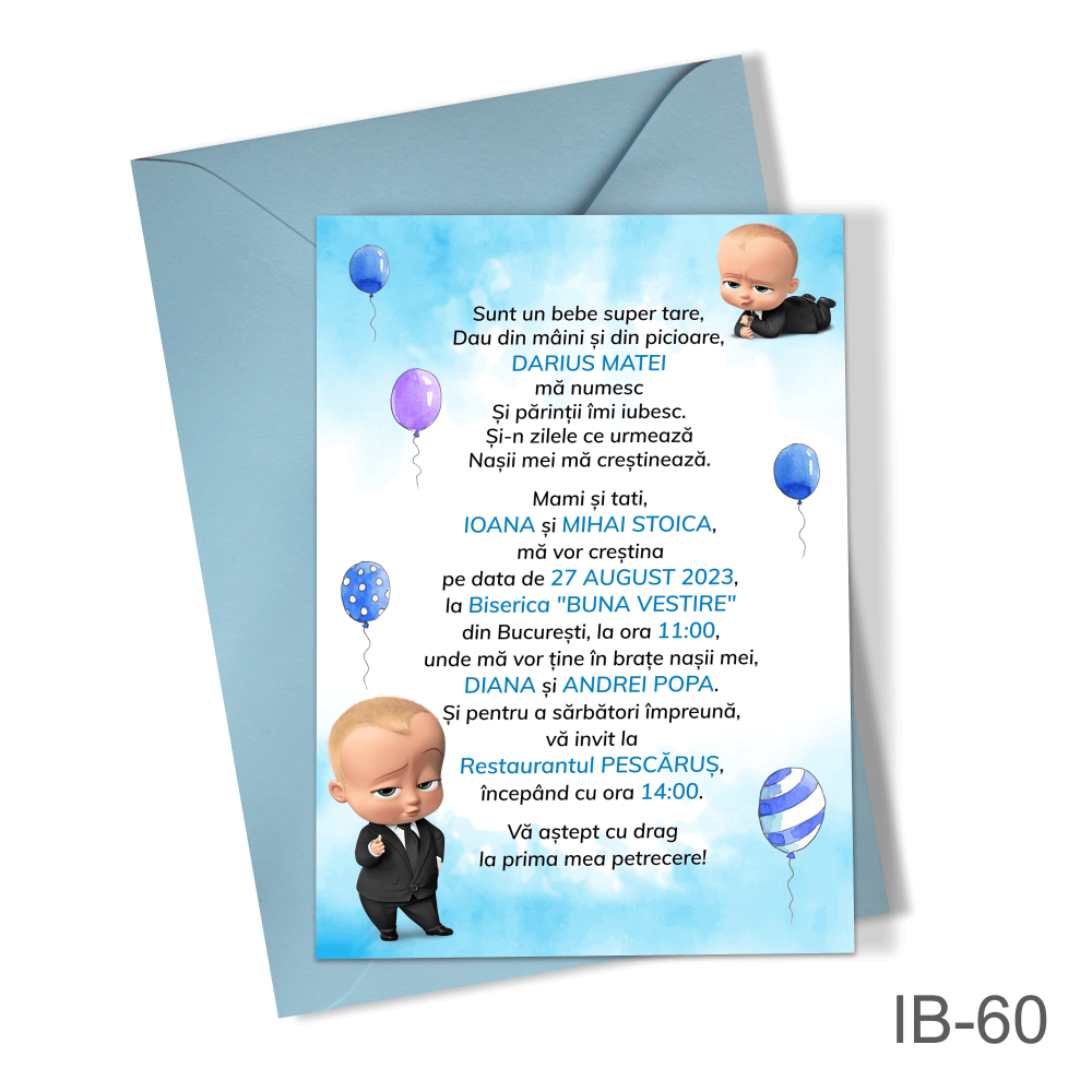 - Personalizare: numele copilului, data evenimentului și un text scurt opțional