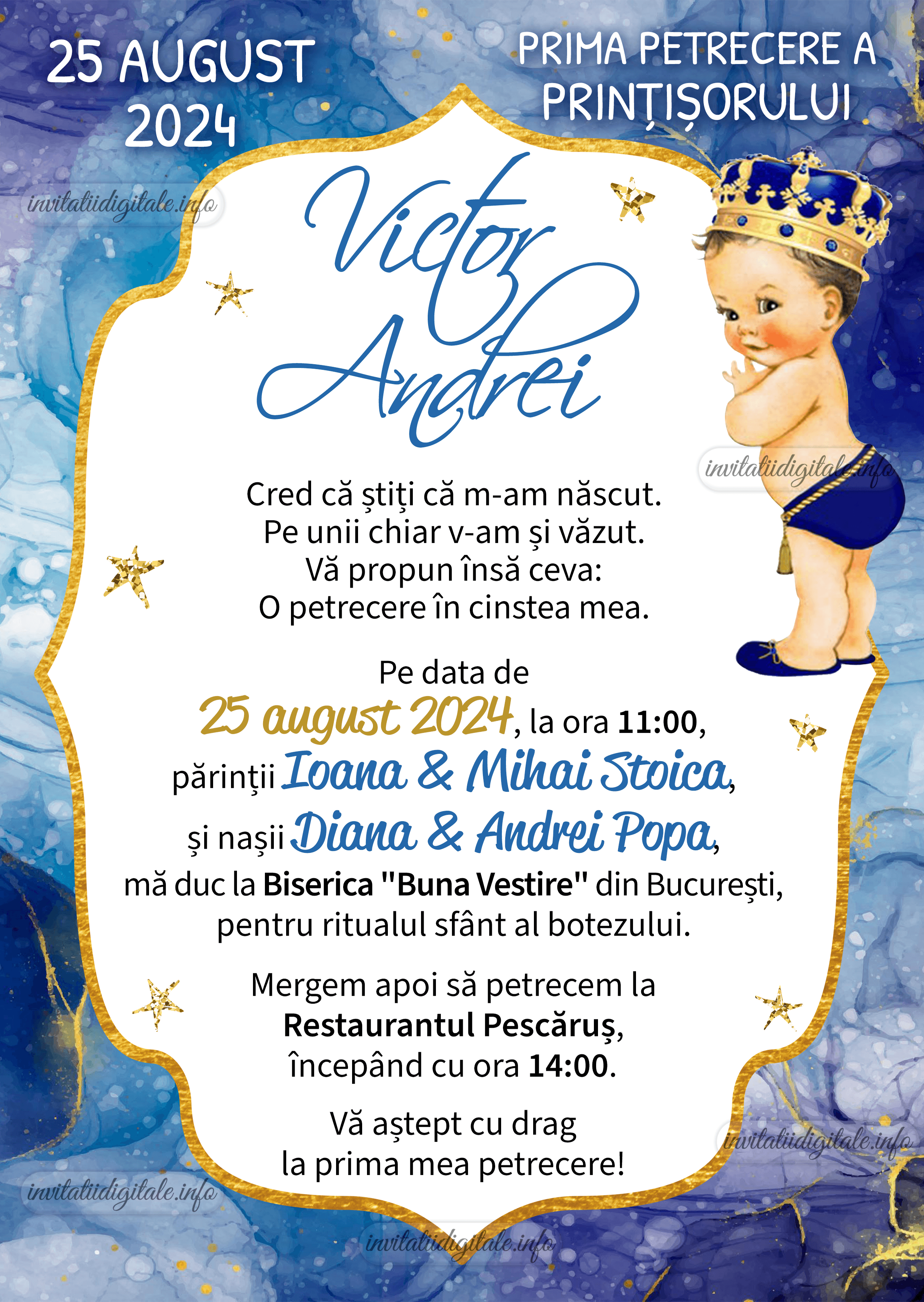 Invitatie de botez in format digital (JPG,PDF) cu tematica Micul Print, pentru telefon mobil si email.