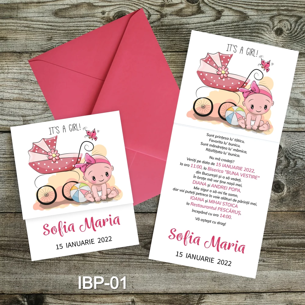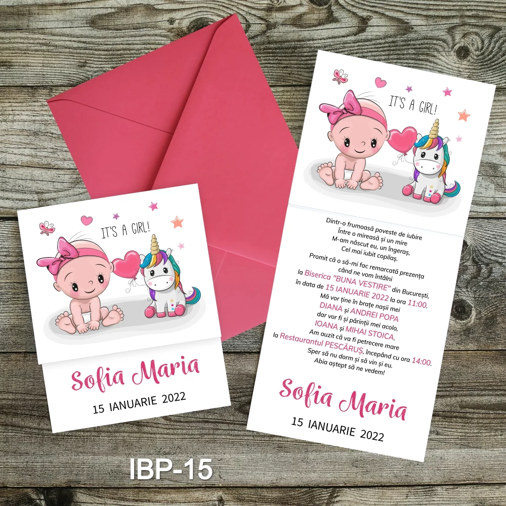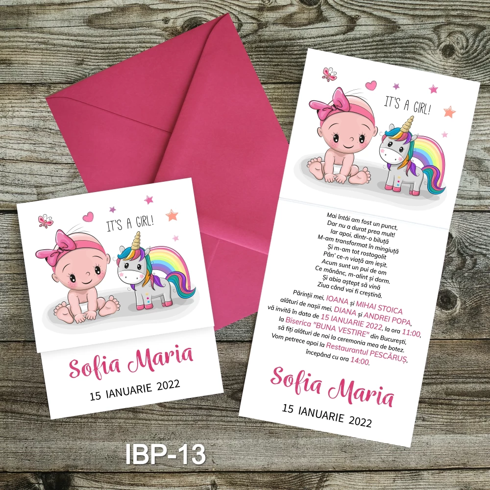 Invitatiile pentru botez sunt realizate din carton lucios foto de 250g/mp.