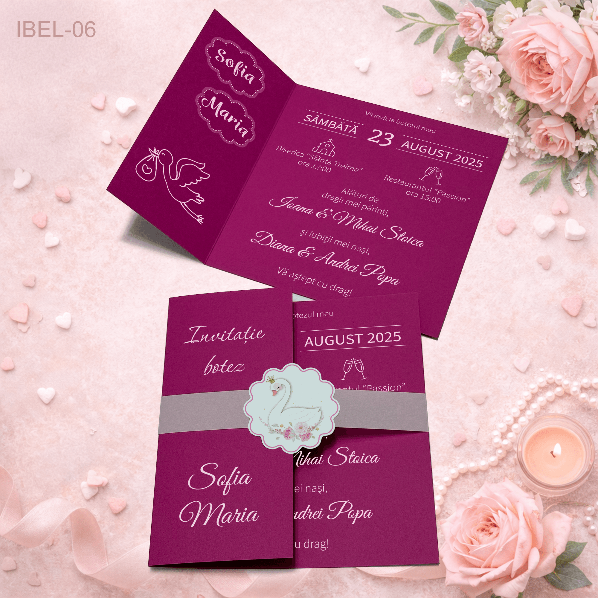 Invitațiile de botez cu tematica Lebada sunt alegerea perfectă pentru a anunța într-un mod elegant și fermecător evenimentul special al micuței voastre. Realizate cu atenție la detalii, acestea combină un design delicat cu o prezentare sofisticată, potrivită pentru un botez memorabil.