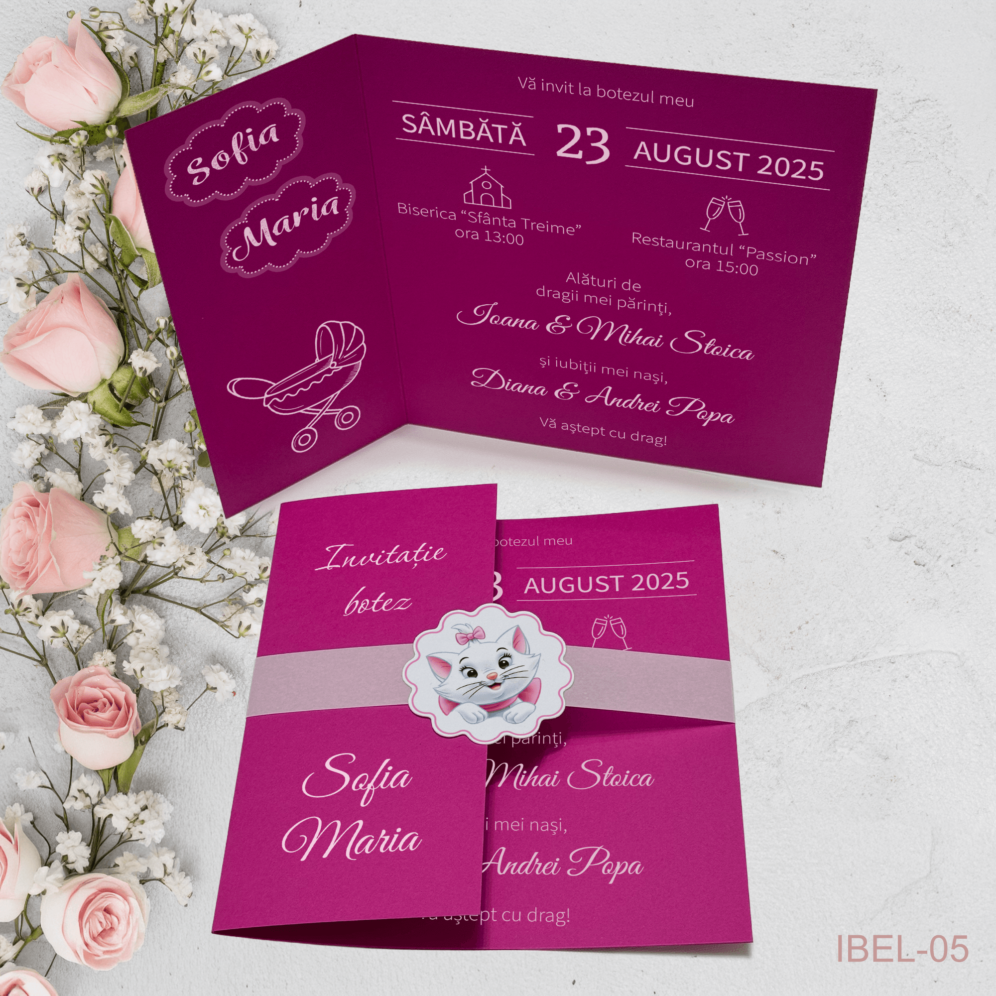 Invitațiile de botez cu tematica Pisicuta Marie sunt alegerea perfectă pentru a anunța într-un mod elegant și fermecător evenimentul special al micuței voastre. Realizate cu atenție la detalii, acestea combină un design delicat cu o prezentare sofisticată, potrivită pentru un botez memorabil.