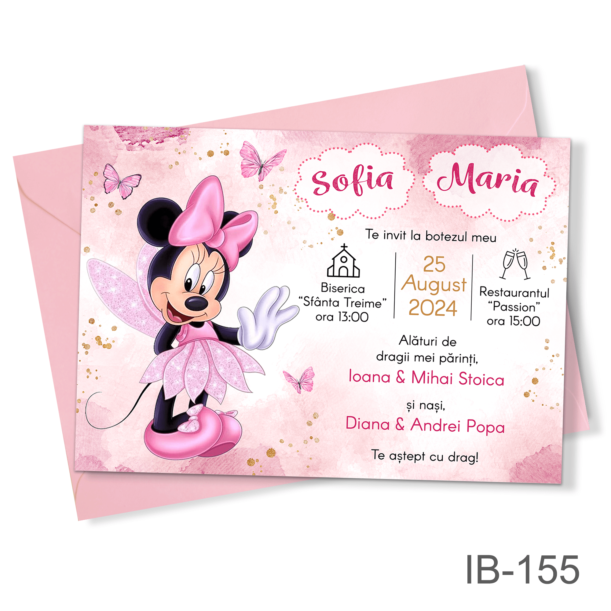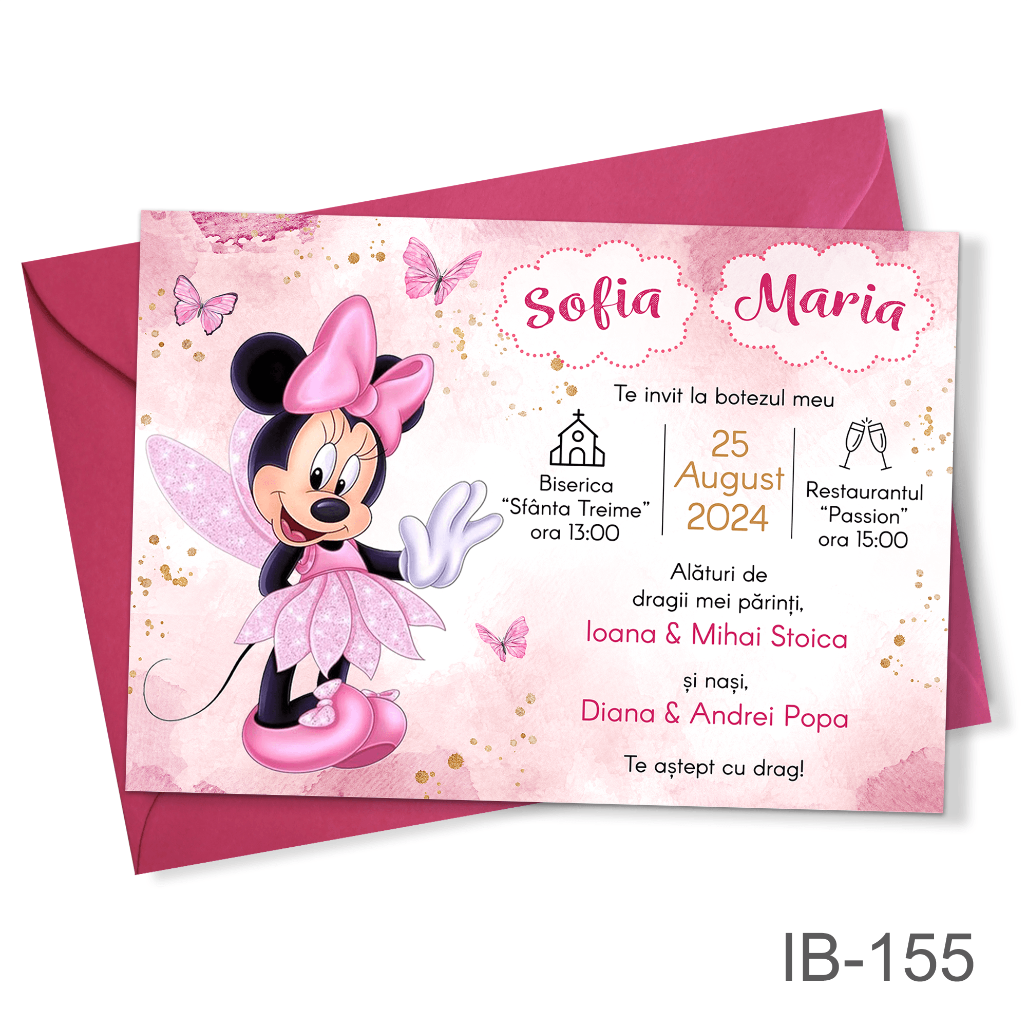 Invitatii botez fetite cu plic colorat – Minnie Mouse Zana – IB-155
