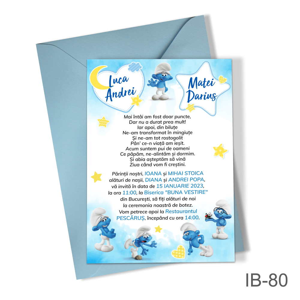 Invitatii botez gemeni baieti cu eticheta si plic Albastru - IBE-88