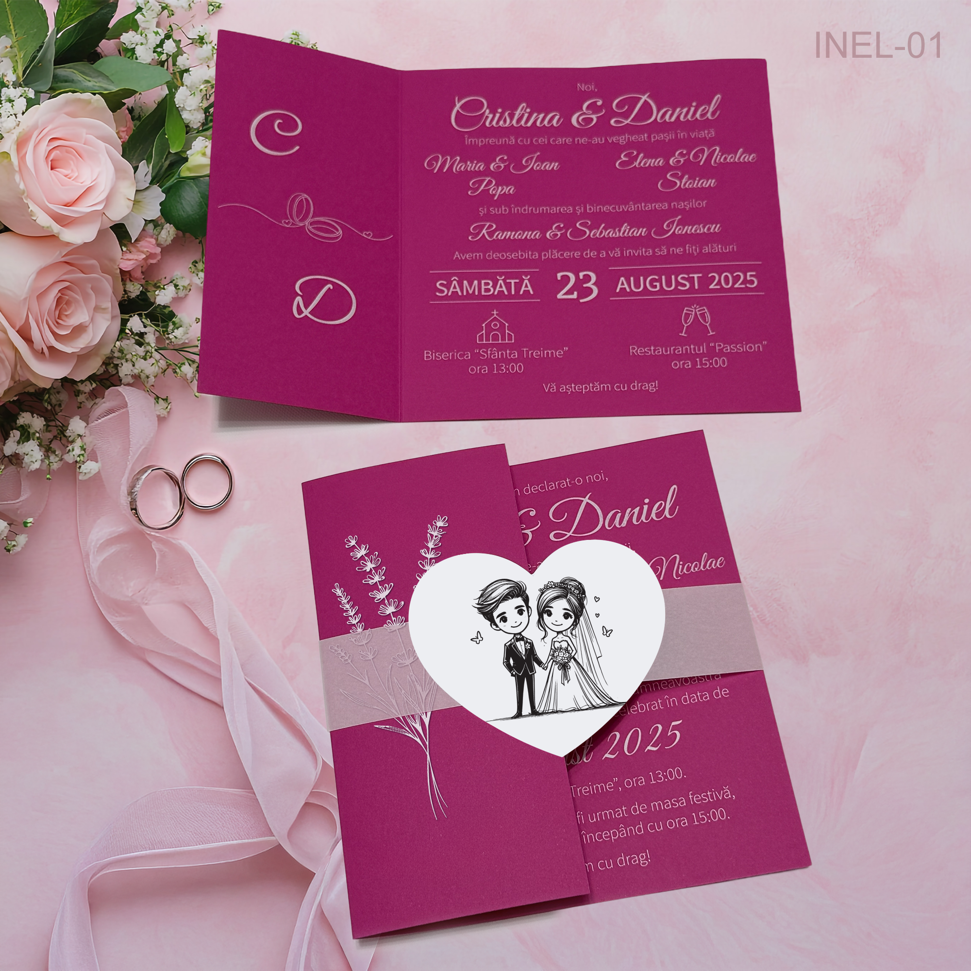 Include: invitație pliabilă + bandă decorativă + etichetă în formă de inimă