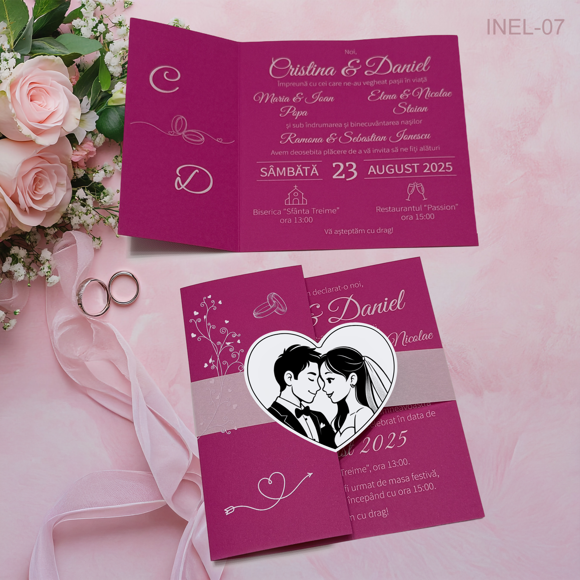 Include: invitație pliabilă + bandă decorativă + etichetă în formă de inimă
