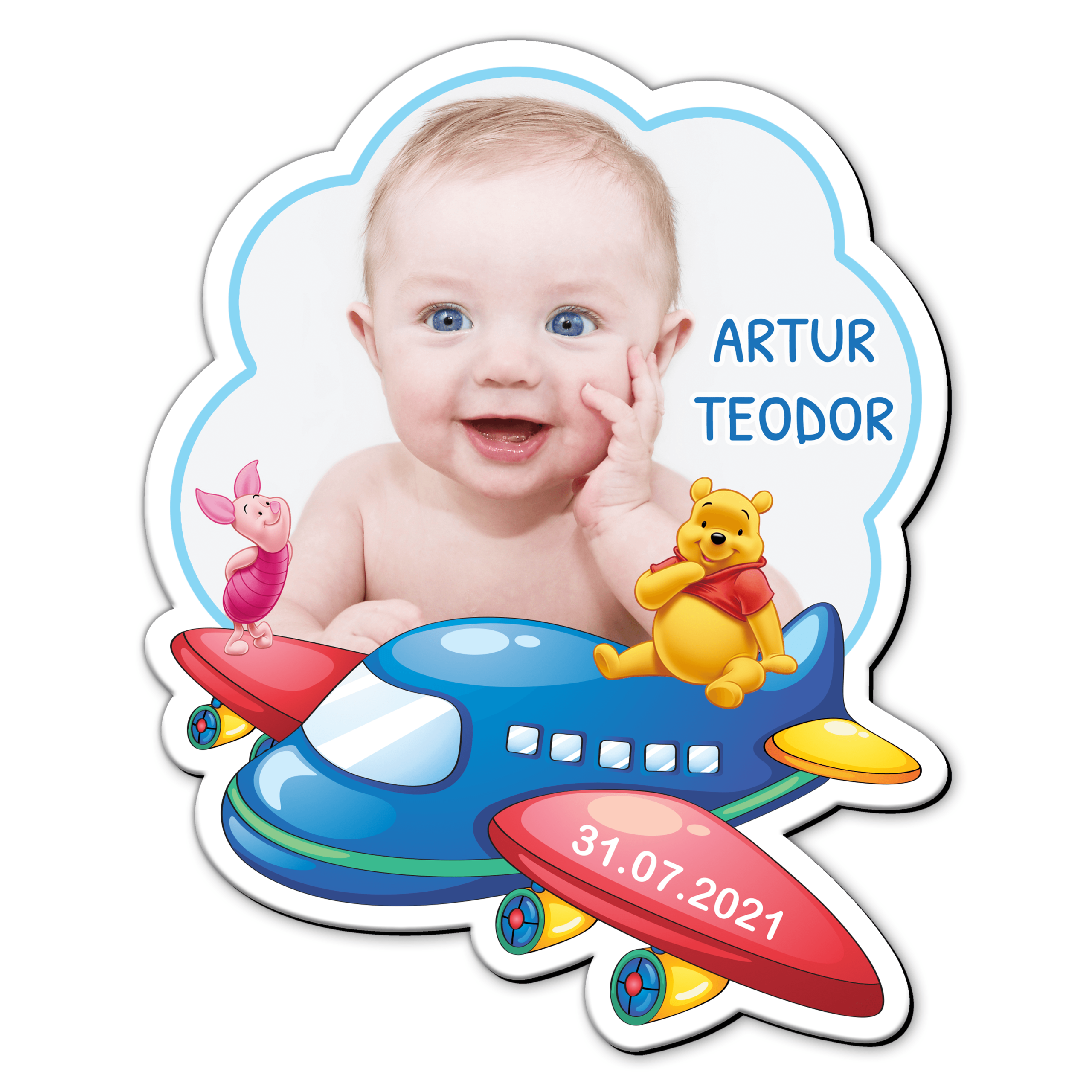 Magnetii decupati in forma de avion cu Winnie the Pooh si Piglet, personalizati cu fotografia bebelusului sunt un cadou special oferit ca marturie de botez.