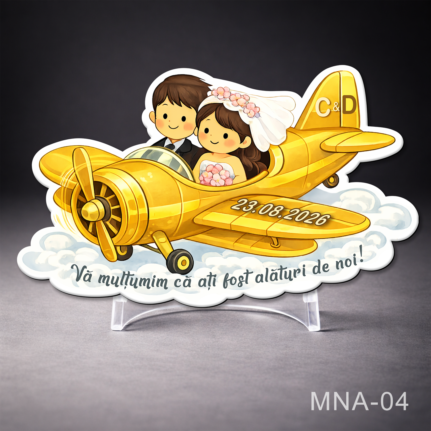 Transformă ziua nunții tale într-o amintire de neuitat cu această mărturie magnet personalizată în formă de avion, ilustrând un cuplu de miri adorabili în plină aventură. Acest model este alegerea perfectă pentru mirii care își doresc ceva diferit, creativ și plin de emoție.