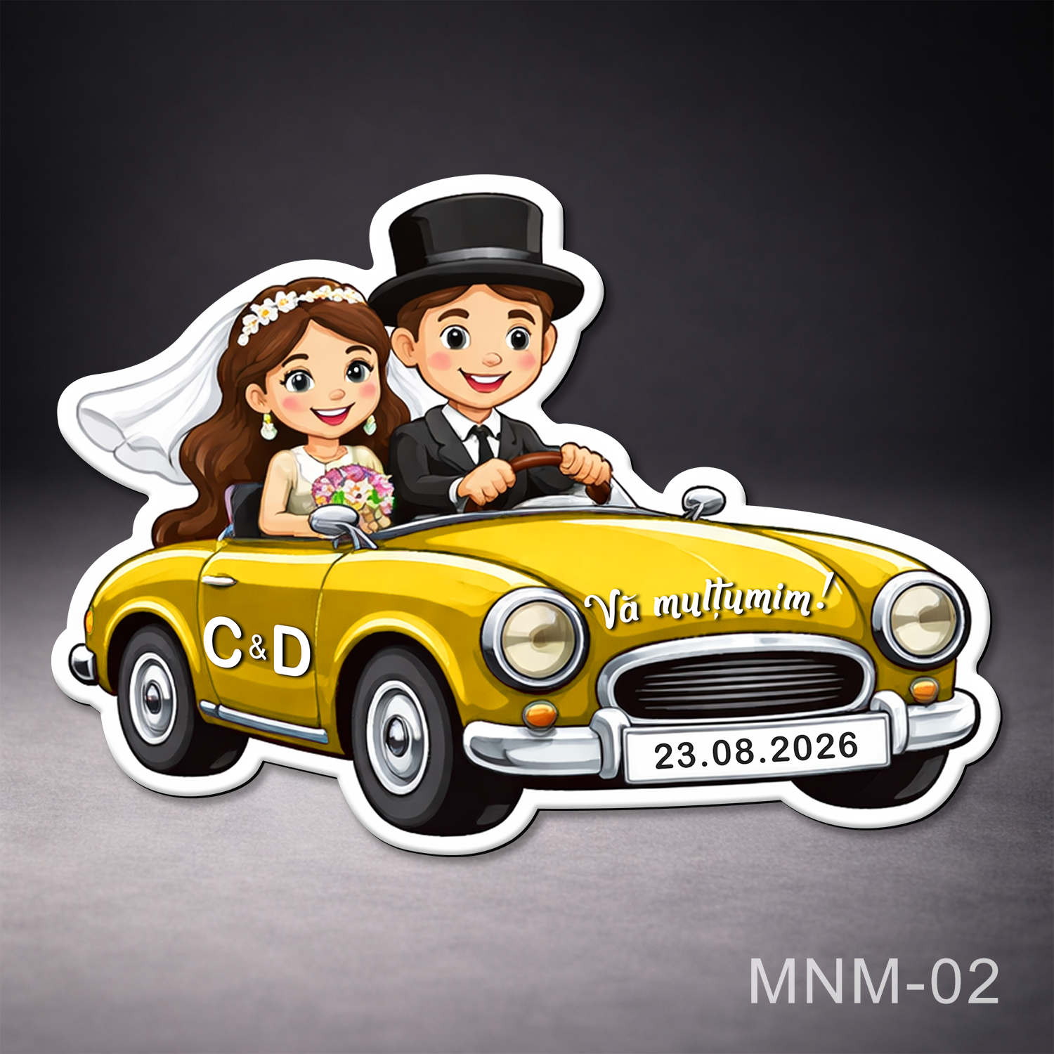 Adaugă un strop de eleganță și veselie nunții tale cu această mărturie magnet personalizată în formă de mașină, ilustrând mirii într-un moment plin de emoție și bucurie. Modelul surprinde perfect începutul drumului în doi, simbolizat printr-o mașină clasică și un design adorabil.