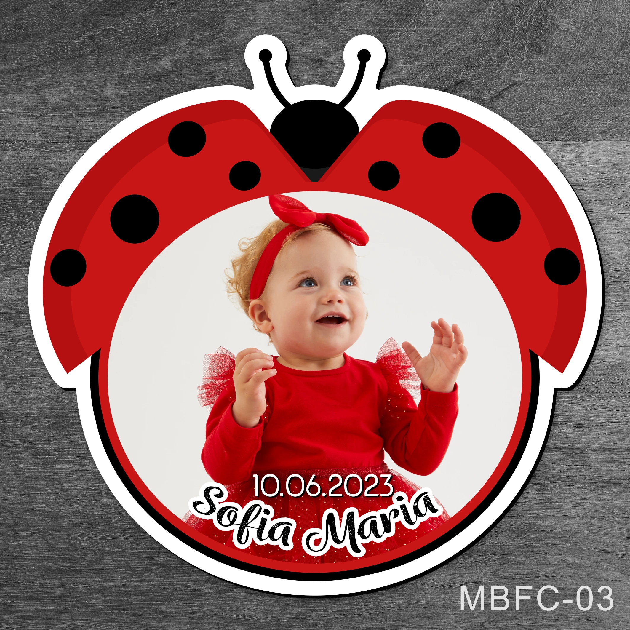 Magnetii personalizati cu poza bebelusului, tematica Buburuza, sunt alegerea perfecta pentru a oferi celor dragi o amintire deosebita ca marturie de botez.