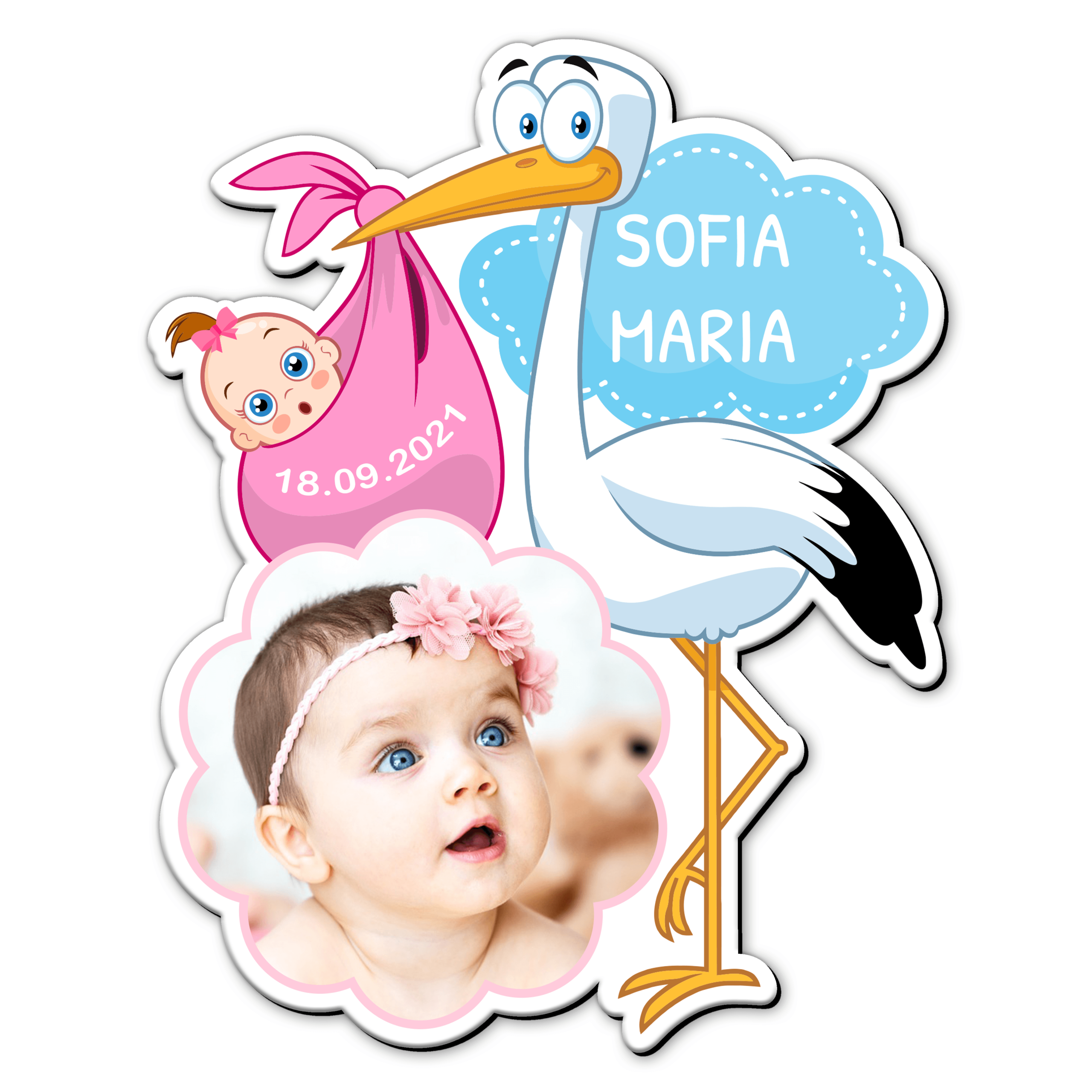 Magnetii decupati cu barza care aduce bebelusul, personalizati cu fotografia copilului sunt un cadou special oferit ca marturie de botez.