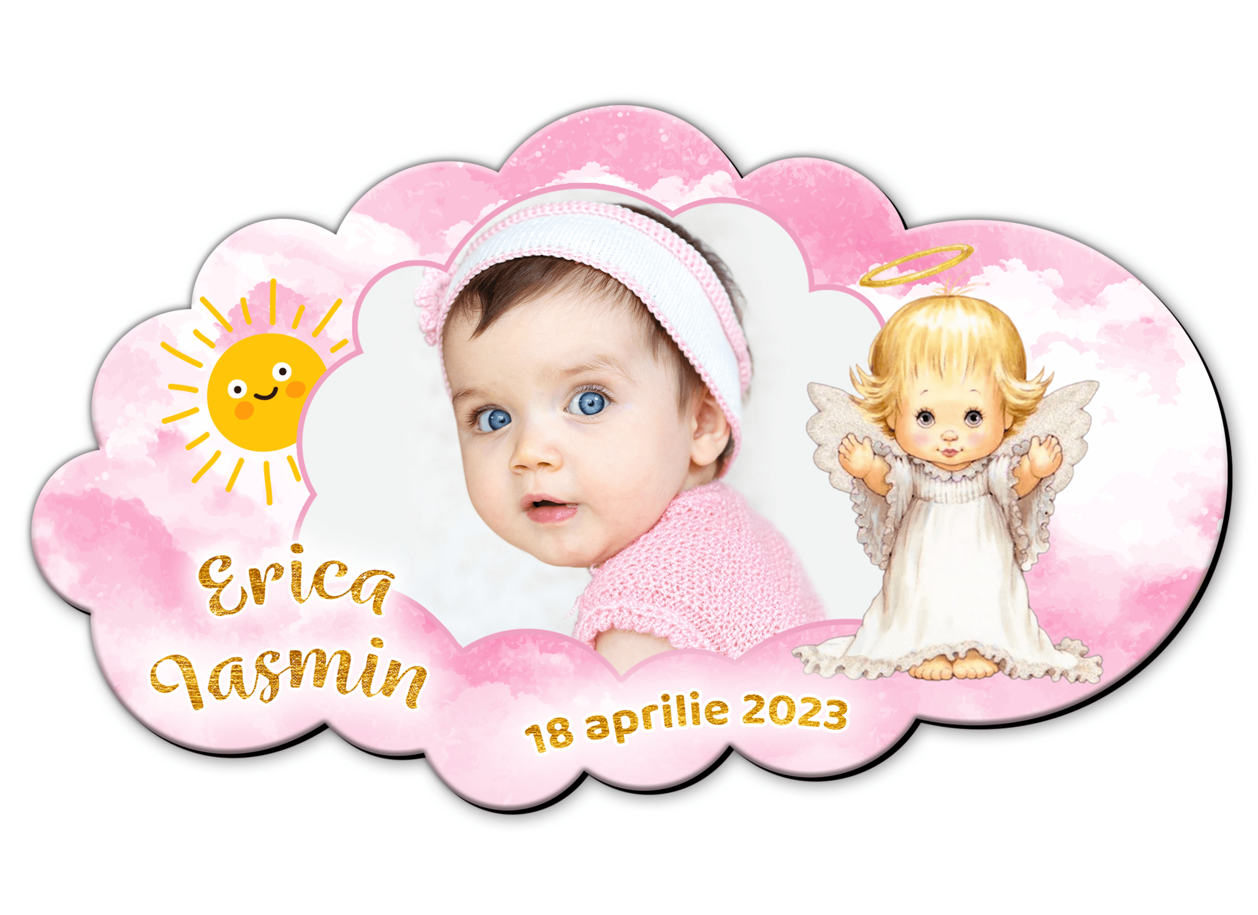 Magnetii decupati in forma de norisor cu Ingeras, personalizati cu fotografia bebelusului sunt un cadou special oferit ca marturie de botez.