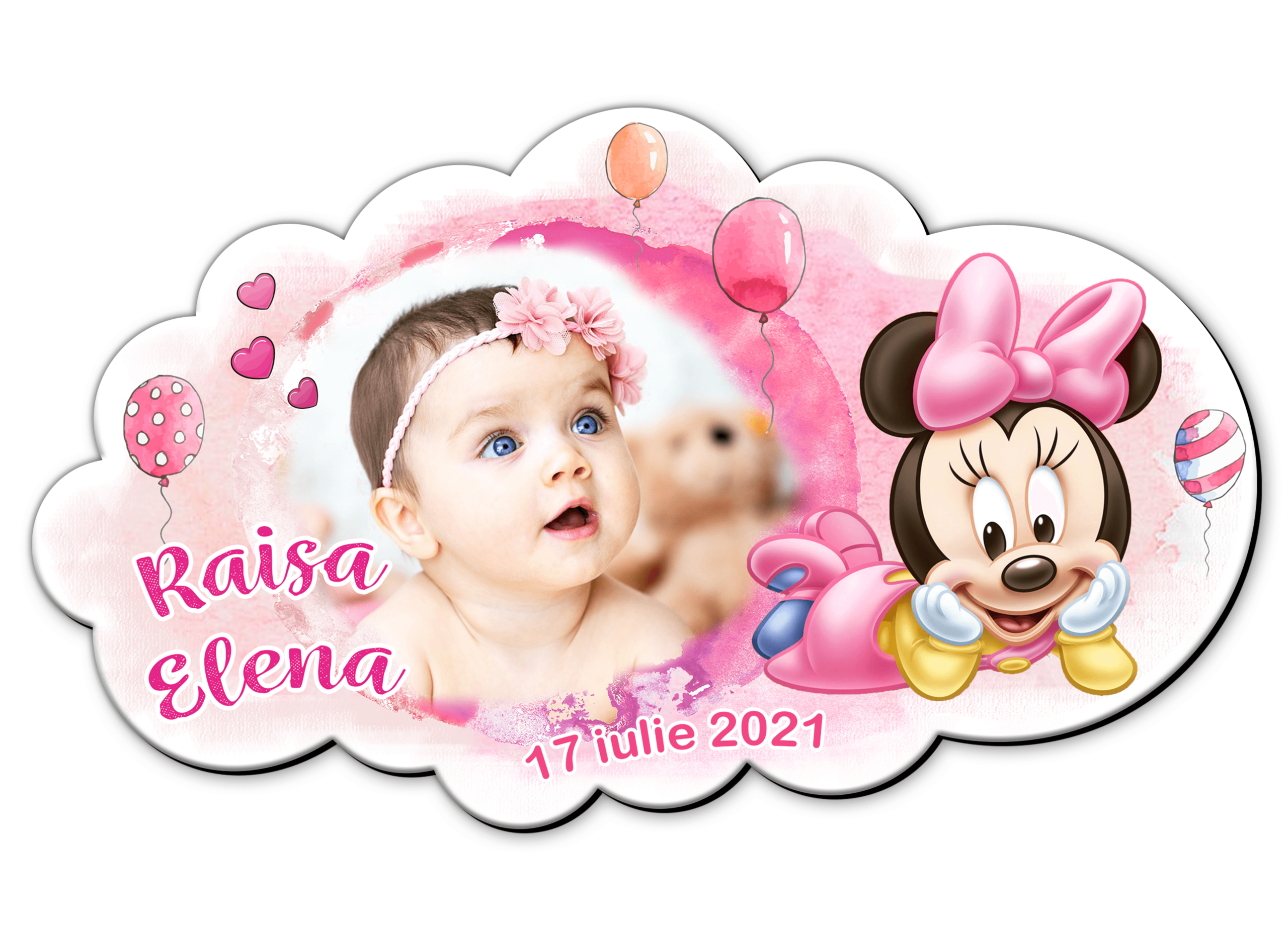Magnetii decupati in forma de norisor cu Minnie Mouse, personalizati cu fotografia bebelusului sunt un cadou special oferit ca marturie de botez.