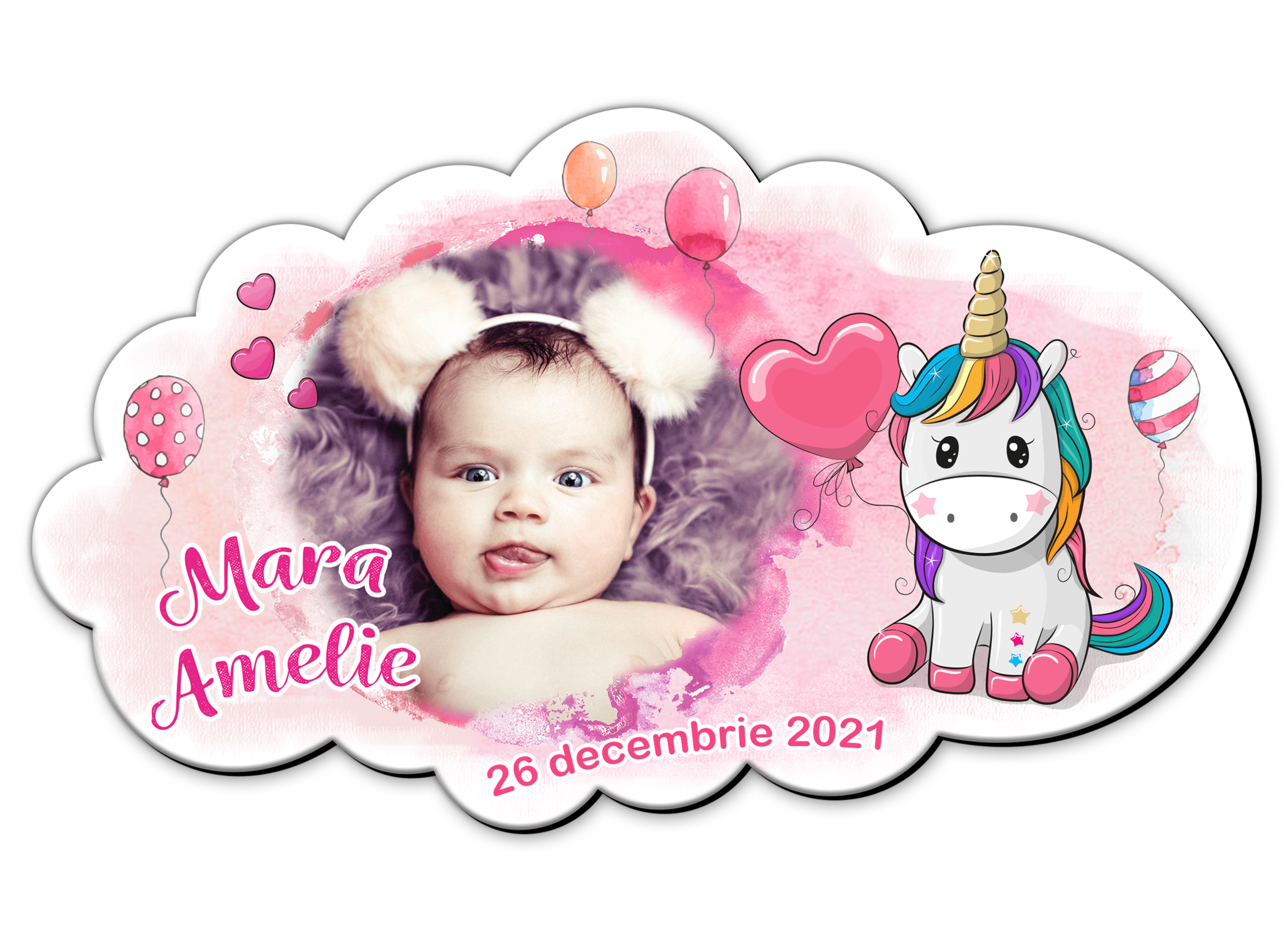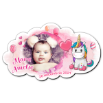 Magnetii decupati in forma de norisor cu Unicorn, personalizati cu fotografia bebelusului sunt un cadou special oferit ca marturie de botez.