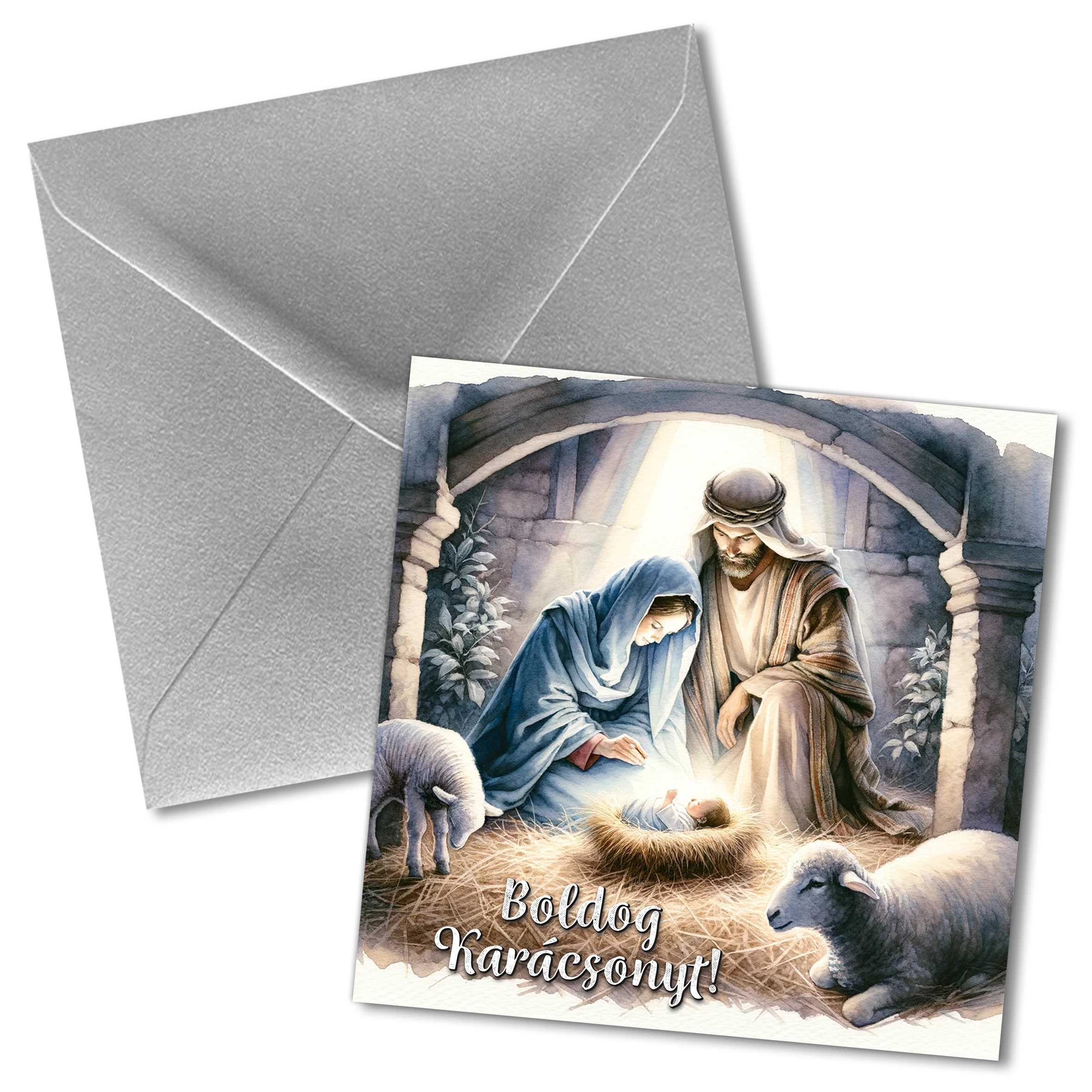 Set 5 felicitari cu Nasterea Domnului in maghiara 13×13 cm cu plic argintiu inclus FCP-26hu