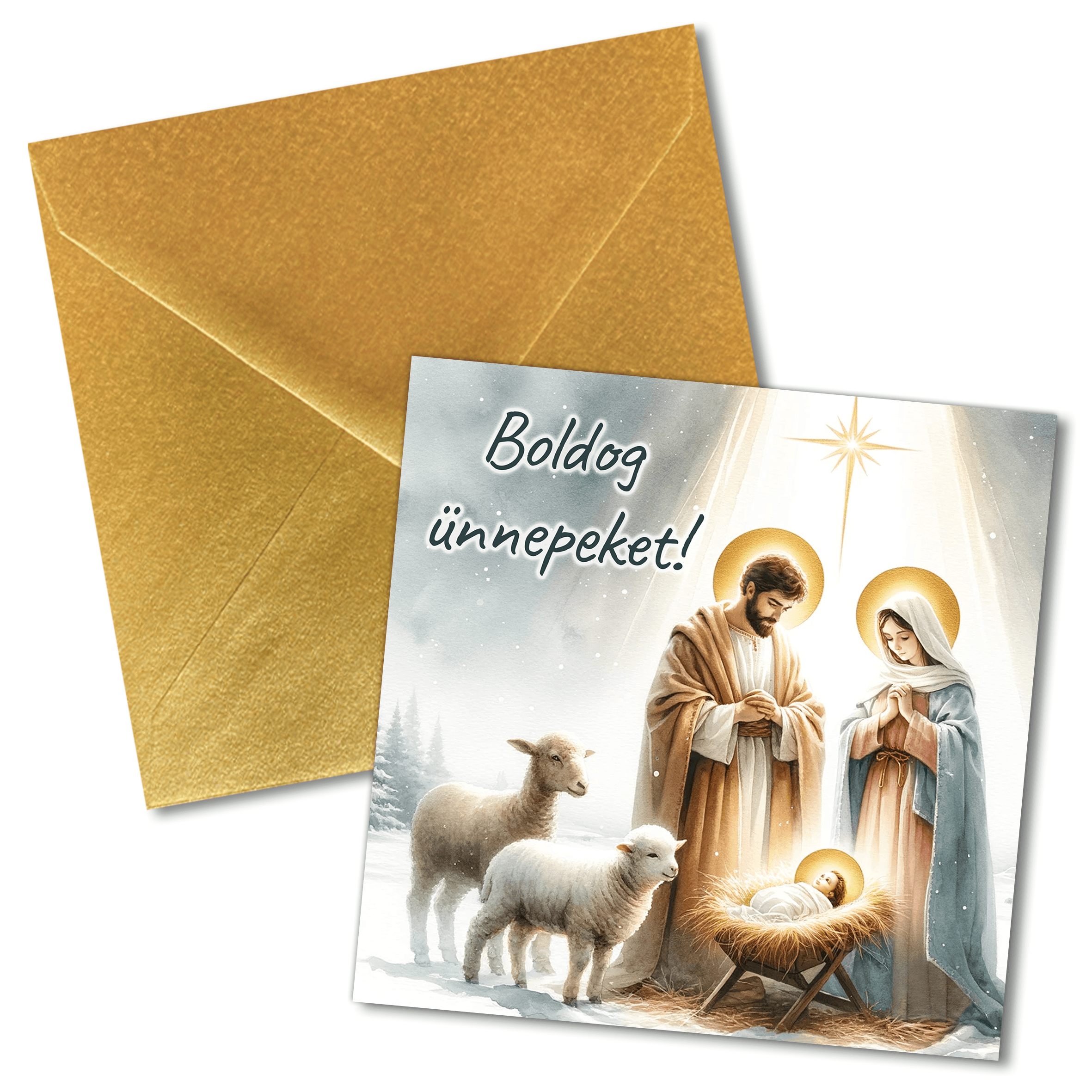 Set 5 felicitari cu Nasterea Domnului in maghiara 13×13 cm cu plic auriu inclus FCP-32hu