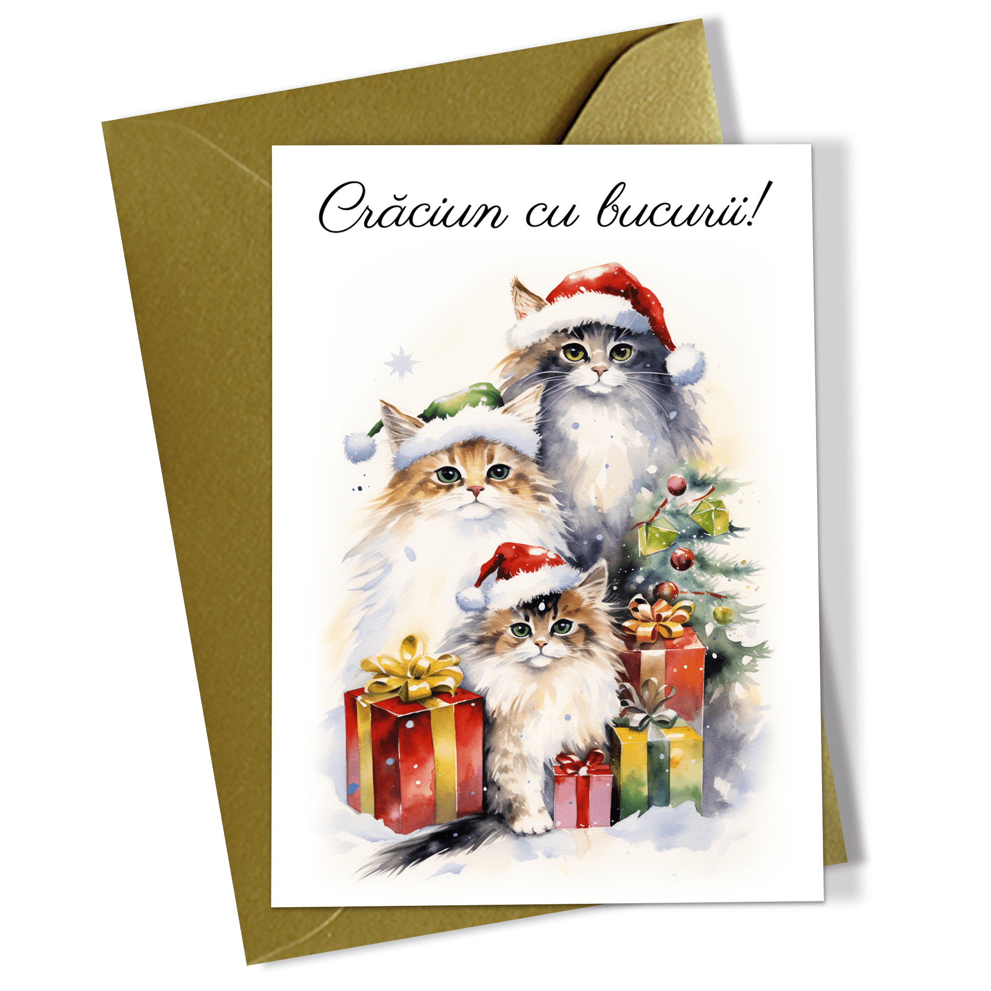 Set 5 felicitari de Craciun 10×15 cm cu plic auriu inclus – Pisici – FC-75