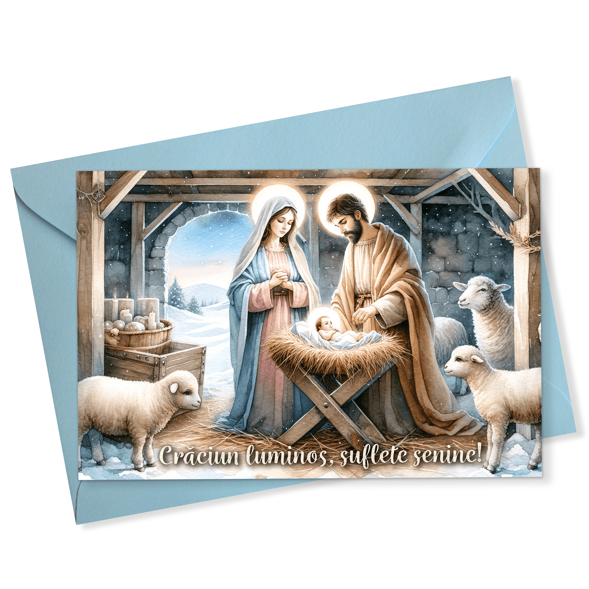 Set 5 felicitari de Craciun cu Nasterea Domnului 10×15 cm cu plic albastru deschis inclus – FC-54