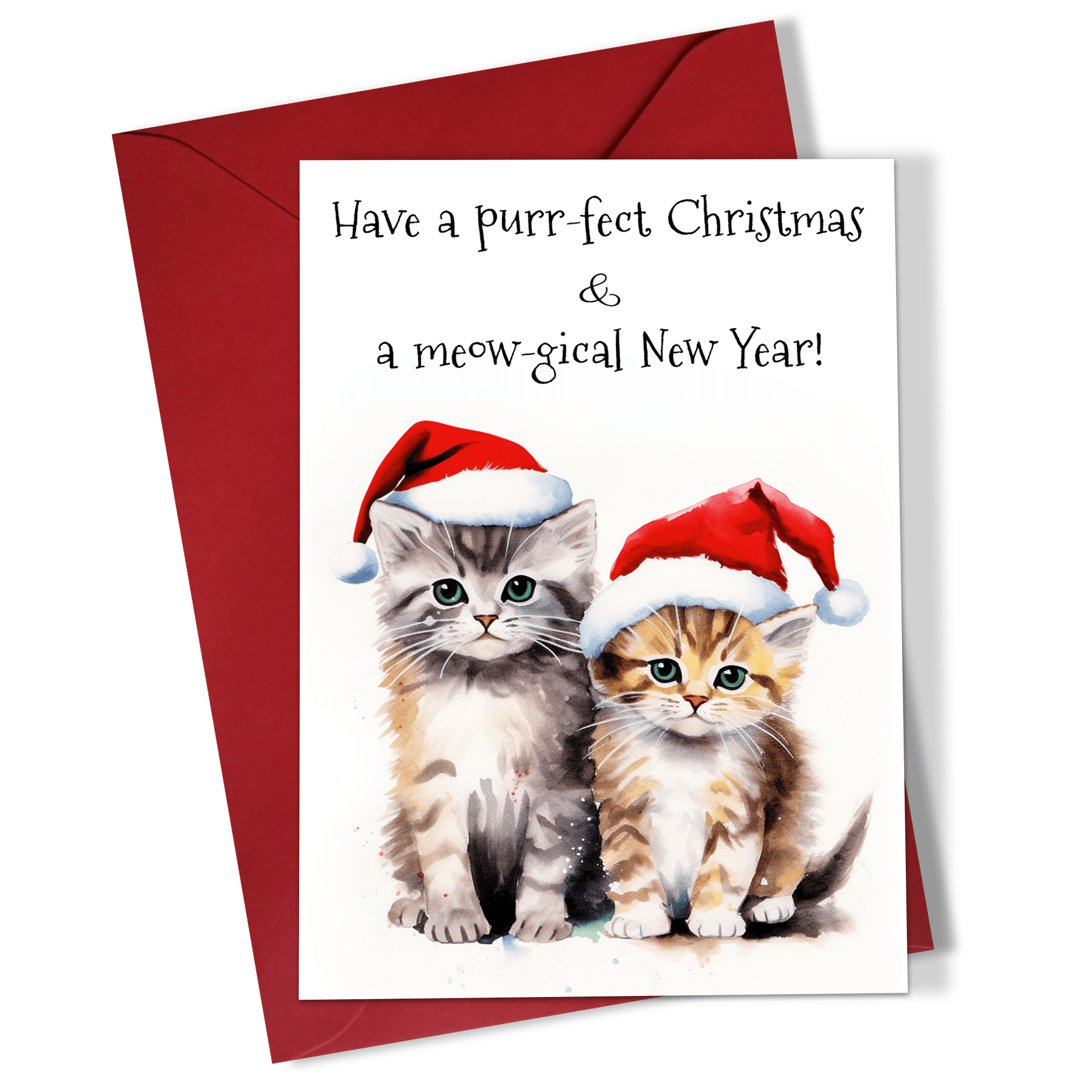 Set 5 felicitari in engleza de Craciun 10x15 cm cu plic rosu inclus - Pisica - FC-78
