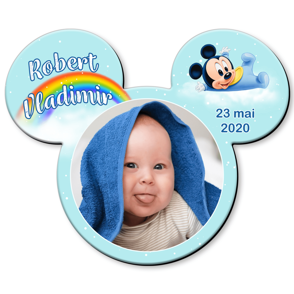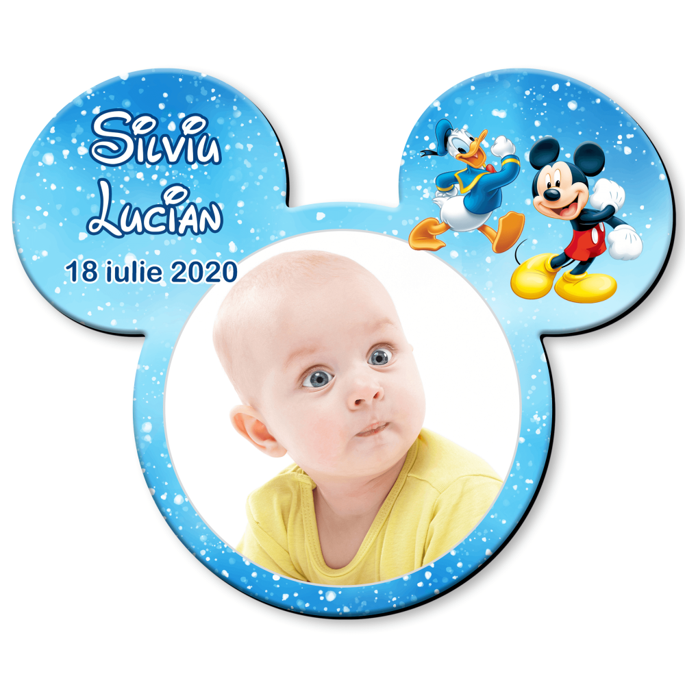 Gama noastră cuprinde variante unde silueta celebră se îmbină armonios cu detaliile de personalizare alese de părinți. Putem integra mici ilustrații cu nasturi galbeni, steluțe magice sau fundaluri vesele pe acești magneti botez Mickey realizați în atelier. Tehnologia digitală asigură o redare uniformă a tuturor nuanțelor pe suprafața magnetică de cea mai înaltă calitate. Evităm orice imperfecțiune, oferind o claritate fotografică absolută chipului bebelușului vostru inserat în acest decor magic. Fiecare model de magneti botez Mickey este configurat pentru a respecta estetica actuală a unui produs premium finisat. Culorile sunt aplicate cu precizie pentru un aspect îngrijit, oferind o experiență vizuală deosebită tuturor invitaților voștri. Designul este creat să reziste, păstrând intensitatea culorilor originale intactă.